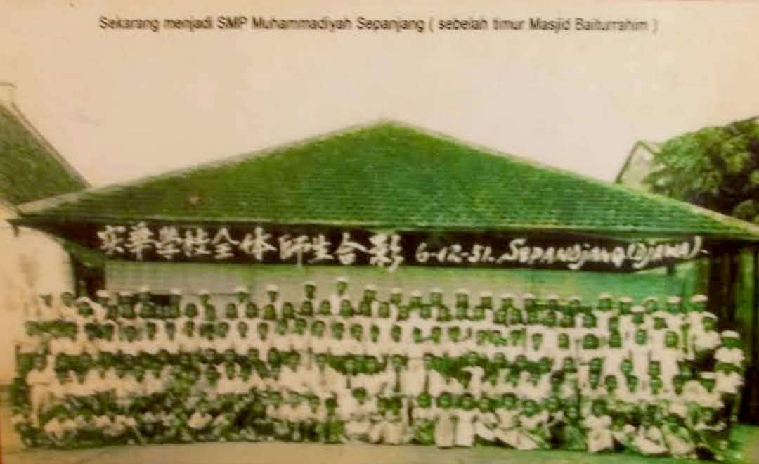 Foto arsip bangunan dan murid Sekolah Tionghoa Zhonghua Xuexie di kawasan Sepanjang, Sidoarjo, yang kini telah beralih fungsi menjadi SMP Muhammadiyah 2 Taman.