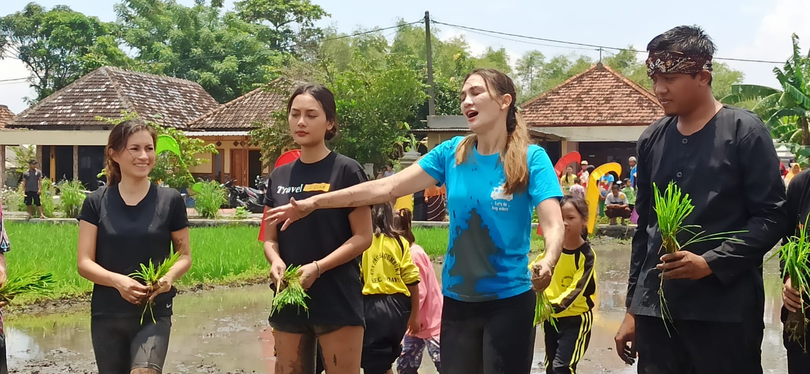 Di area persawahan, Luna Maya dan dua sahabatnya ikut menanam padi hingga bermain bersama anak-anak KLG. Ketiganya tampak menikmati permainan yang digelar anak-anak KLG.