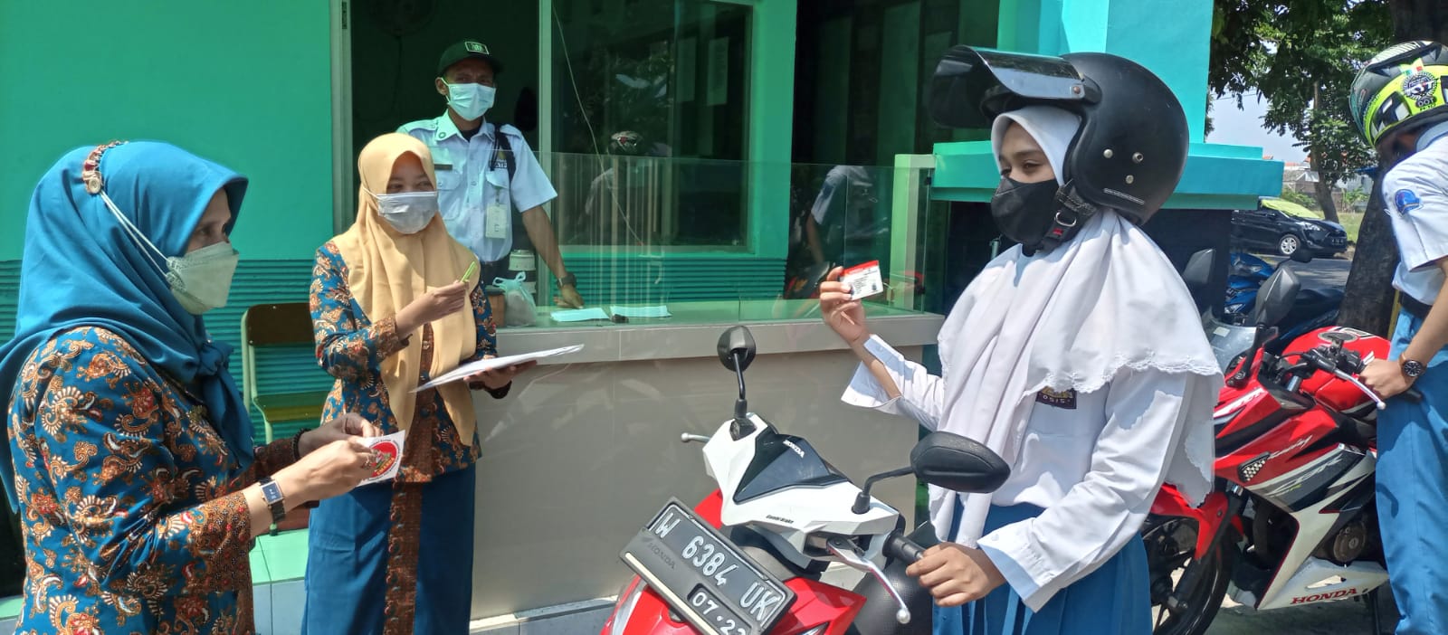 Jadi tiap akan masuk ke sekolah, petugas cukup melihat stiker yang ada di motor. Siswa tidak perlu mengeluarkan SIM lagi. Selain itu, siswa juga dicek suhu.