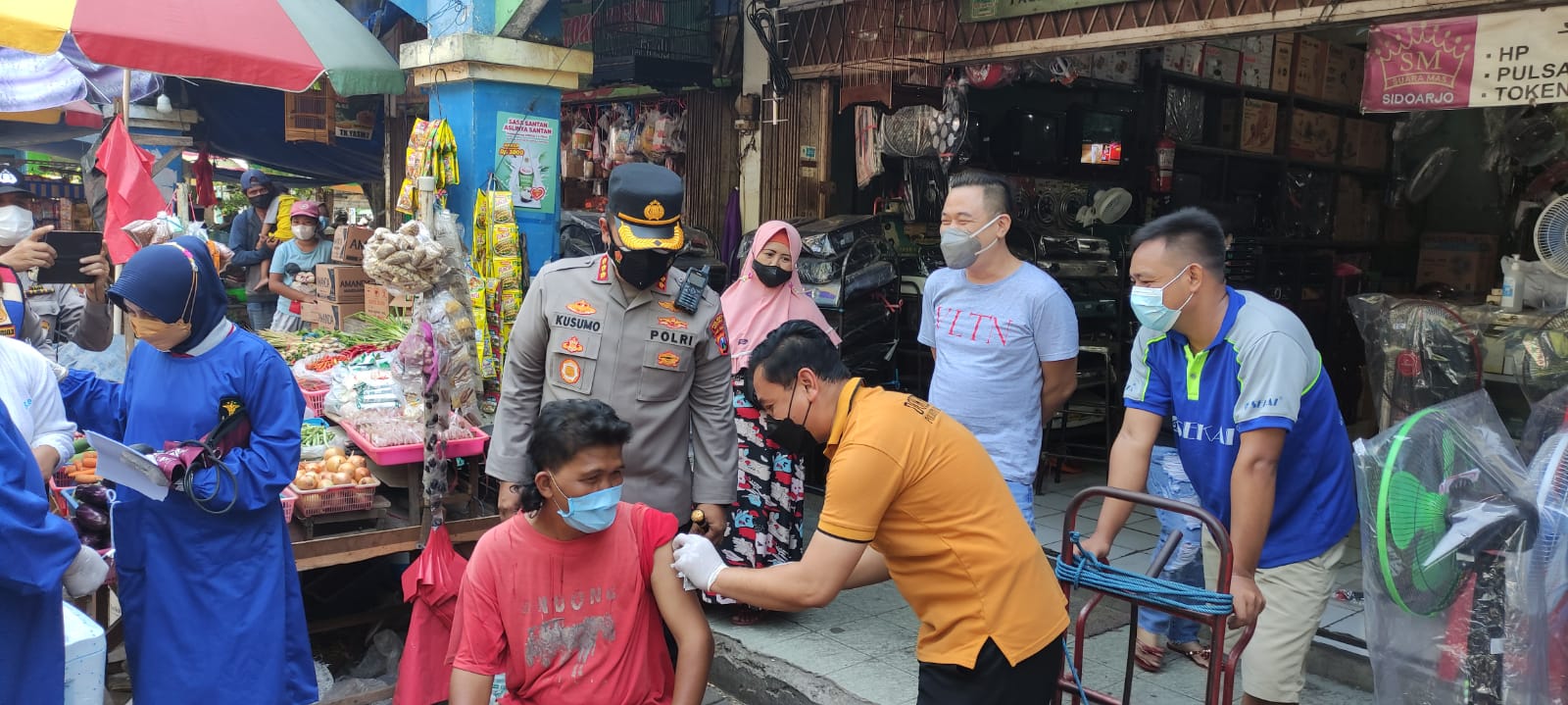 Untuk lebih memasifkan akselerasi vaksinasi Covid-19, Kapolresta Sidoarjo Kombes Pol. Kusumo Wahyu Bintoro pun ikut turun langsung mengedukasi masyarakat, agar segera di suntik vaksin. Seperti Minggu (10/10/2021), lulusan AKABRI 1998 ini rela blusukan ke dalam Pasar Larangan, Candi, Sidoarjo, guna hunting masyarakat dan pedagang yang belum vaksin.