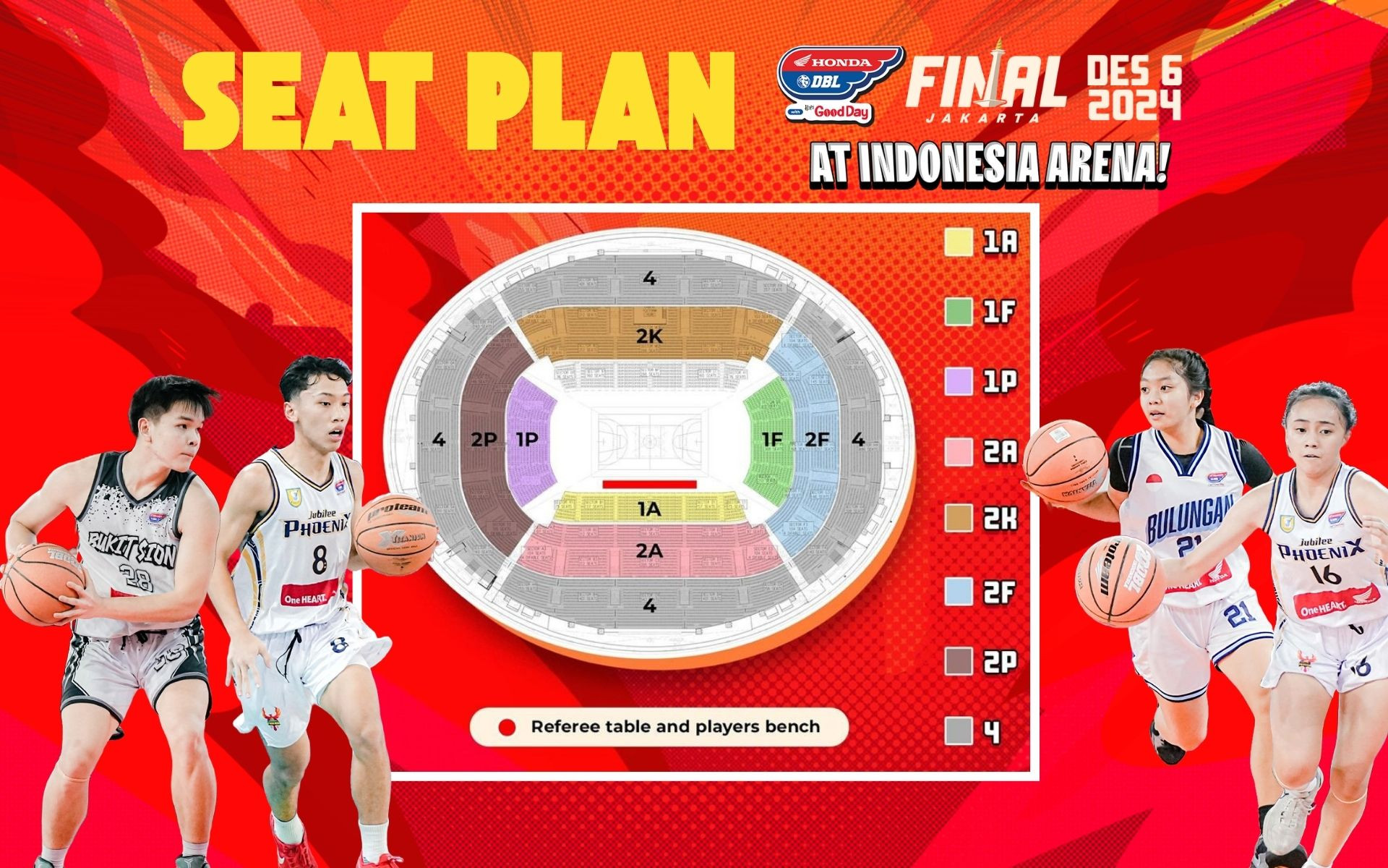 Secara seat plan yang menghadap lapangan adalah sektor 1A, 2A, dan 2K. Sementara kategori 1F, 1P, 2F, dan 2P, berada di sisi kanan dan kiri atau menghadap ring basket. Sedangkan kategori 4 tribunnya mengelilingi lapangan. Selengkapnya lihat grafis di bawah ini.
